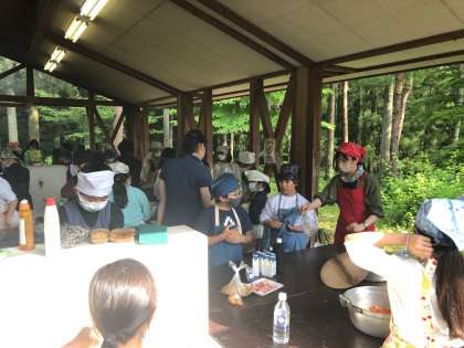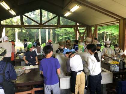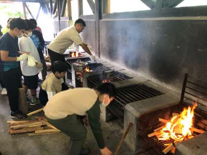飯盒炊爨が始まりました。かまどでは、火をつけるのに一生懸命です。カレーの具材を切っている人もいます。みんな楽しそうです。