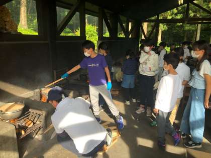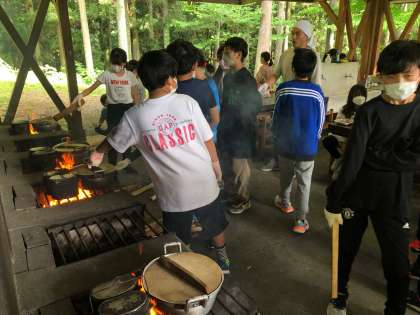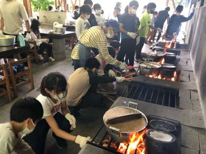 カレーライスの調理はほぼ終わり、あとはかまど待ちです。かまど担当の人たちが頑張って火の見守りをしています。