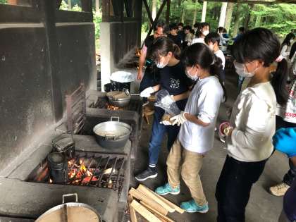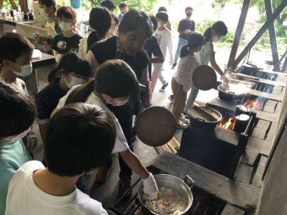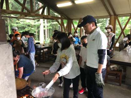 そろそろカレーライスも完成に近づいています。お肉を入れて、カレー粉を入れています。