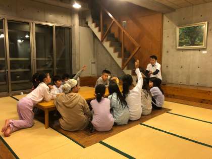 お風呂も入り終わり、1日を振り返る室長会議です。今日、1日を振り返るとともに、明日の活動の確認です。今日は子どもたちのすてきな姿が見られました。いい振り返りが、たくさんありました。