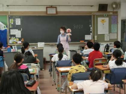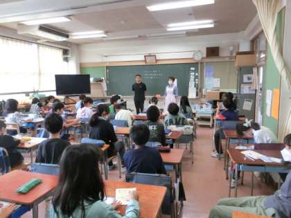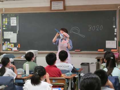 今日、5年生は歯みがき指導の日です。養護の先生から、歯みがきの仕方について授業がありました。80歳になっても20本の歯を残すためには、大切なことです。歯ブラシの動かし方やデンタルフロスの使い方を教えてもらいました。