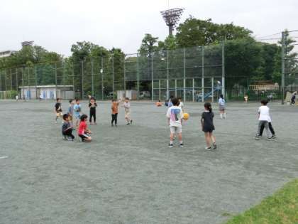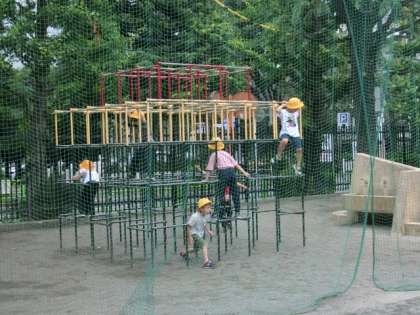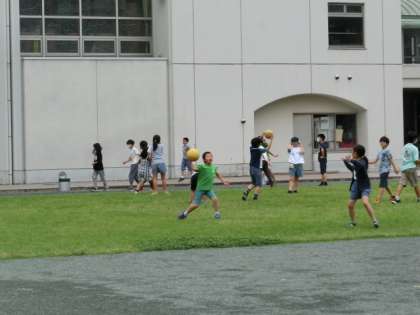 昼休みの時間です。子どもたちが遊んでいます。ボール遊びをしている人たちが多いですが、1年生はジャングルジムで遊んでいる人が多いです。