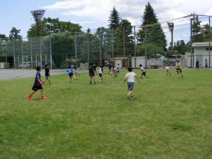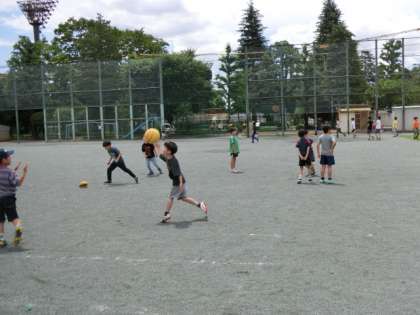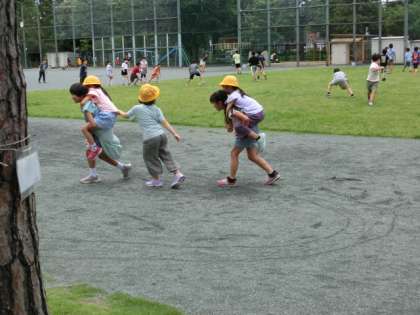 ボール遊び、走りっこなどをしています。3年生が1年生のことをおんぶしてあげています。1年生はとても喜んでいます。