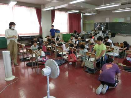 5年生の授業は音楽です。「いろいろな音色を感じとろう」と題して、オーケストラを聴き、その音色の動きを線で表しています。子どもたちは静かに聞いています。
