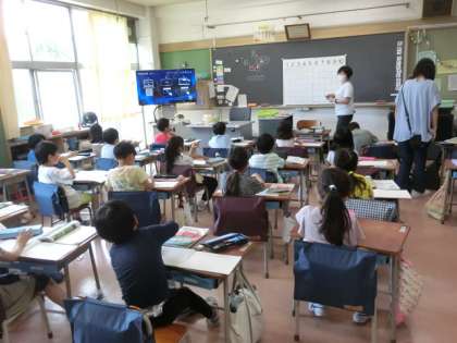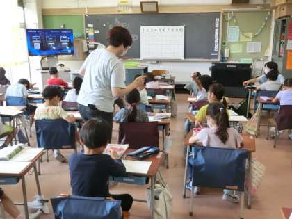 1組の授業は算数です。たし算の文章題を図で表し、式に直しています。ブロックを使ったり、図で表すことが1年生にはとても大切なことです。そういう作業を大切にしていってほしいと思っています。