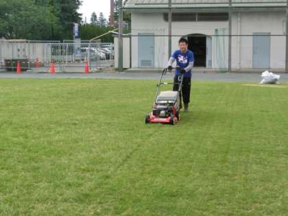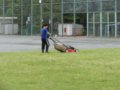授業の隙間をぬって、主事さんが芝刈りをしてくれています。芝が伸びてくると、走りにくくなるだけではなく、つまずいて転んでしまいます。刈ったあとは、じゅうたんのようにきれいになっていました。