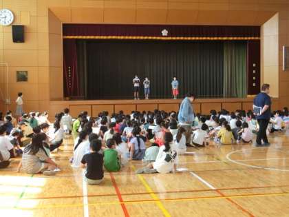 今日は集会委員会の人たちによるゲーム集会です。「校内スタンプラリー」です。校内に集会委員会の人たちがひそんでいます。それを見つけてじゃんけんをして、サインをもらいます。何個集めることができるでしょうか。