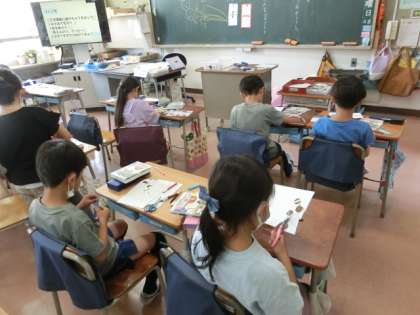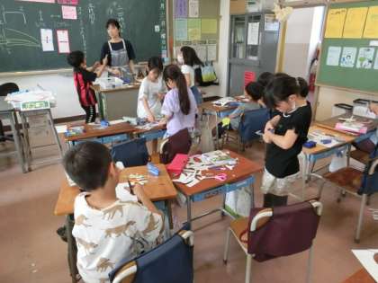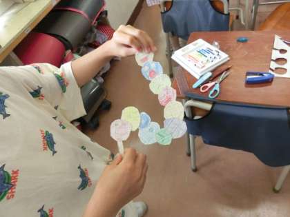 2組の授業も図工でした。同じ内容の授業でも、クラスがかわると、できあがる作品の様子が変わるものです。こちらのクラスは、連結する作品が多くありました。とても面白い動きをしています。
