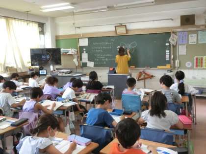 2組の授業は理科です。昆虫の学習です。昆虫の身体のつくりをノートにうつしています。足は何本あるか、身体はどんな部分に分かれているかなど、抑えたいポイントがたくさんあります。写真をノートにかきうつすことで、学べることがたくさんあります。