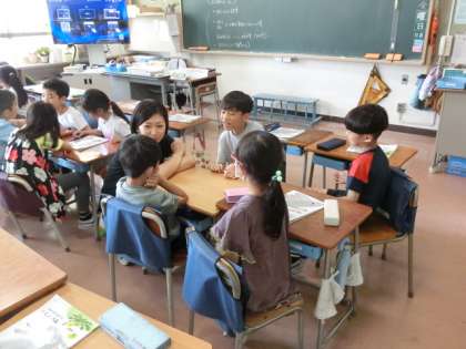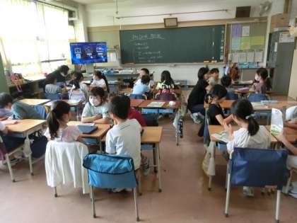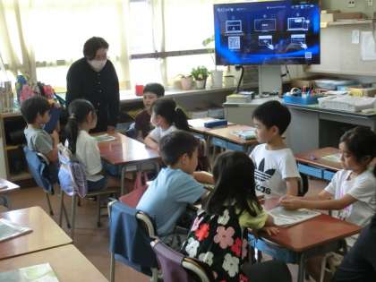 2組の授業は生活です。まちたんけんで見つけた池尻のまちのすてきなところをグループの友達に紹介しあています。