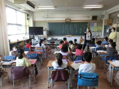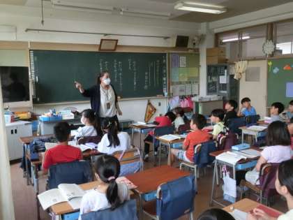 2組の授業は国語です。生活科でおこなったまちたんけんを題材にして池尻のまちを紹介する文章を書く学習です。