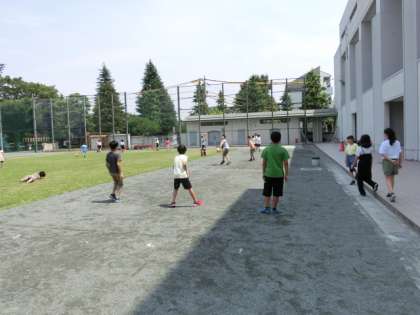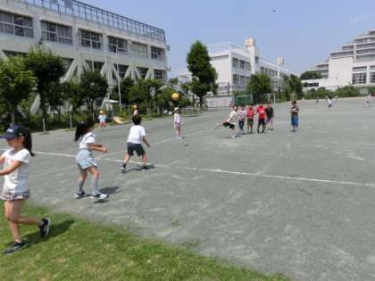 昼休みの時間です。子どもたちが校庭に出てきました。ボール遊びや一輪車、竹馬などいろいろな遊びをしています。