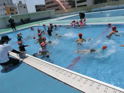水中に落ちているゴムキューブを拾います。子どもたちは、夢中になってもぐっています。とても楽しそうです。