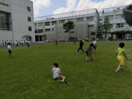 昼休みの時間です。たくさんの子どもたちが校庭に出てきました。