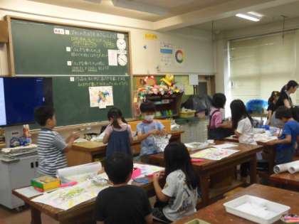 図工では、「ぼかし」の方法のおさらいです。楽しみながら、作品づくりに取り組んでいます。