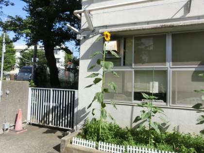 正門の横の花壇にあるひまわりがとても大きくなっています。いつの間にかに、とても大きくなっています。主事さんに話を聞くと、最近の暑さで一気に伸びてきたというのです。