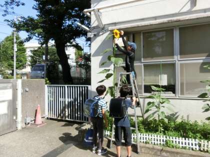 急に伸びてきたため、茎が折れないように、支柱を伸ばす作業をしています。それと、同時に6年生に手伝ってもらって、背の高さもはかっていました。なんと、2m70cmです。植物の成長は、すごいですね。