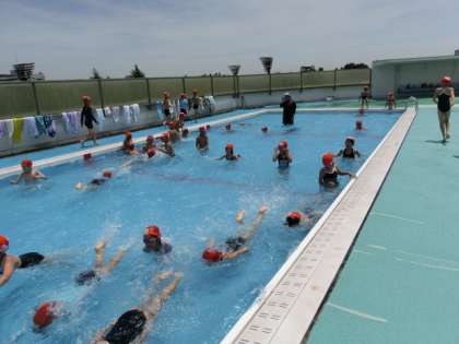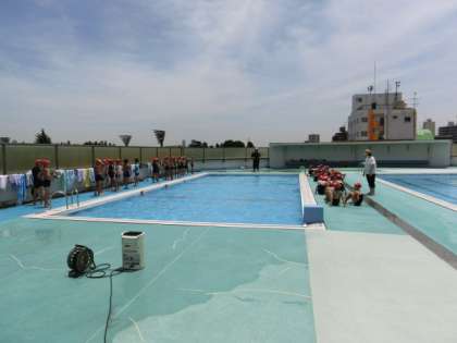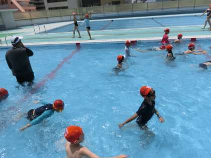 今日は、とても暑いです。水の中に入っている人たちはみんな気持ちよさそうです。バタ足をしたり、頭までもぐったりしながら、水の感覚を楽しんでいました。
