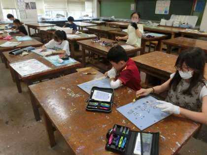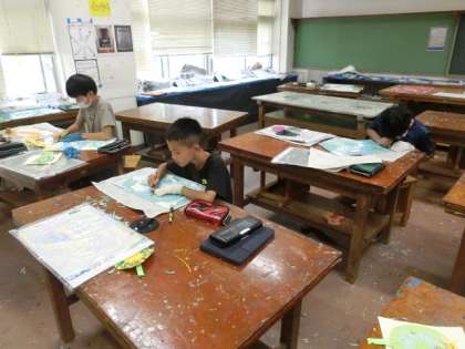 図工室をのぞいてみると、まだ終わっていない作品の仕上げに来ている人たちがきました。