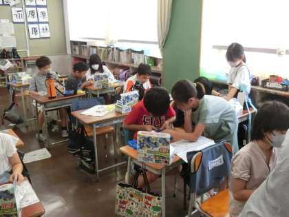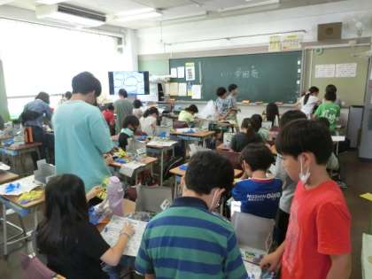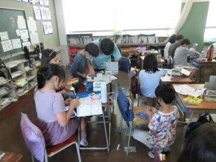 1組の授業は理科です。電流のはたらきの学習です。キットを使って、プロペラを回しています。エナメル線の削り方によっては、電流がうまく流れない場合があります。うまく作れた人は、まだの人に教えてあげていました。