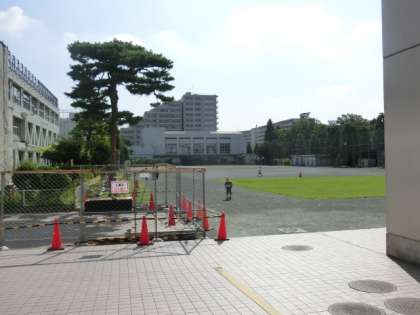 子どもたちの登校です。朝から強い日差しが校庭を照らしています。