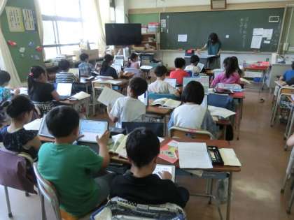 1組の授業は国語です。「はじめて知ったことを知らせよう」という単元です。読書によって知ったことを友達に知らせる学習です。
