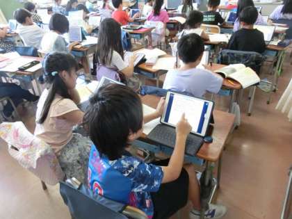 子どもたちは、ワークシートをもとに、本で知ったことをタブレットやノートに書きこんでいます。