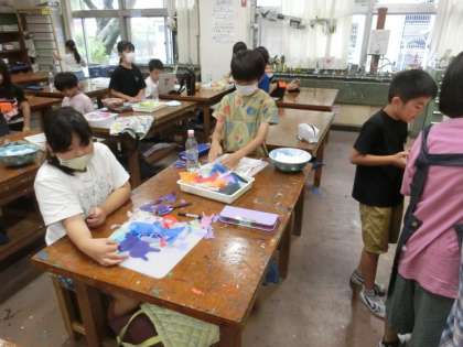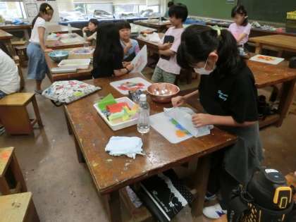 1組の授業は図工です。「のりのりお花紙」と題して、お花紙と洗濯のりを使って、台紙に模様をつくっています。子どもたちは、洗濯のりをかけるときとても嬉しそうです。やったことのないことをやることの喜びなのでしょうか。模様ができると、「見て、見て。」と、たくさん声をかけられました。
