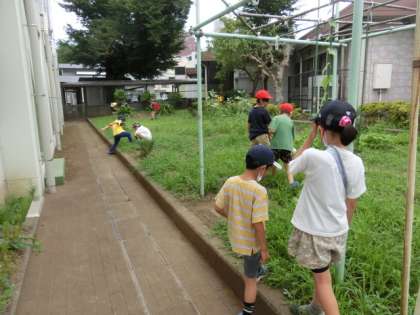 2組の人たちは、ピンク門の前で、虫とりをしていました。生活科の学習です。