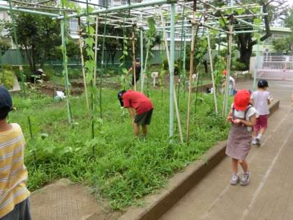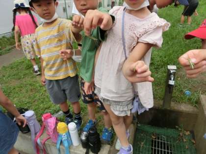 近づいていくと、バッタを持った子どもたちが、見せに来てくれました。大きいのもいれば小さいのもいます。どちらもとても可愛らしいバッタです。嬉しそうにダンゴムシを持っている人もいます。蝉の抜け殻をブローチのように、服に付けている人もいました。