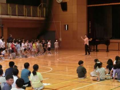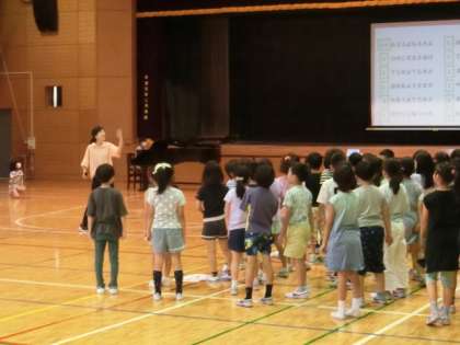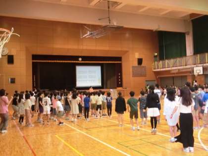 今日は音楽朝会です。みんなで「もえろよ もえろ」を歌いました。簡単な動きを取り入れたり、パートごとに学年で分けたりしながら、楽しく歌いました。