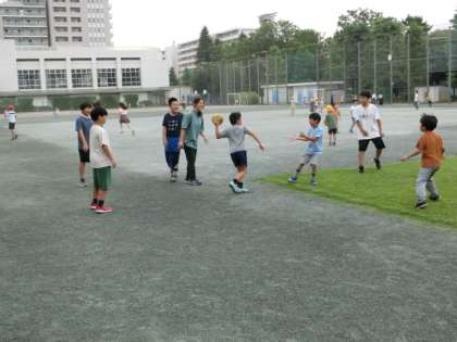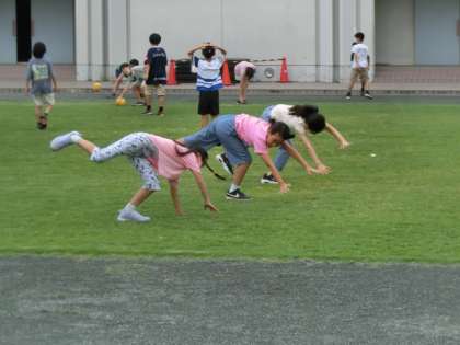 5年生が2年生とボール遊びをしています。上学年と下学年が一緒に遊んでいる姿を見ると嬉しくなります。芝生では、側方倒立回転をみんなでしている人がいます。まるで芝生がマットのようです。