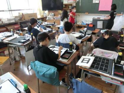 1組の授業は書写です。習字の時間です。「日」という字を書いています。簡単な字ながら、形をとるのがとても難しい字です。