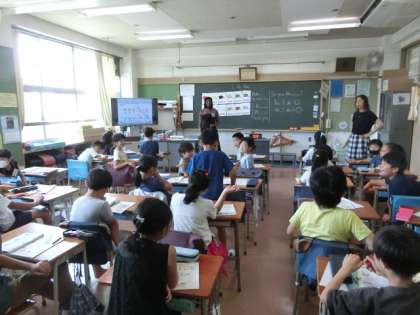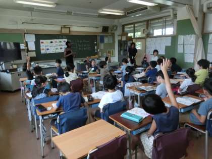 ALTの先生が来てくれています。色の名称の学習をして、自分の好きな色を発表していました。その流れで、自分の好きなものをもう一つ発表していました。