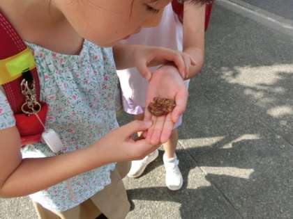 登校の際、いくつものセミの抜け殻を持っている人がいました。聞いてみると、担任の先生に見せて、驚かせるそうです。