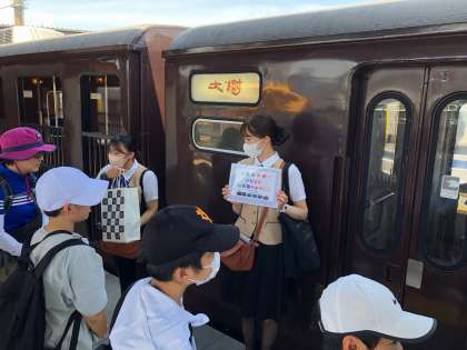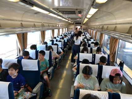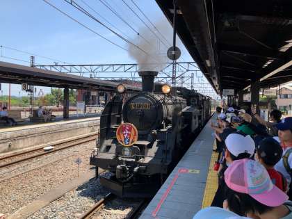 SLがホームに入って来ました。汽笛の音に子どもたちは、びっくりしています。真っ黒い煙がすごい迫力です。