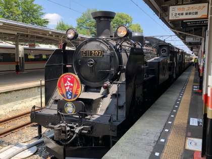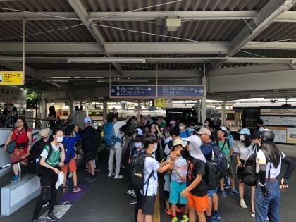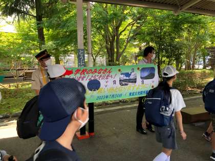 東武日光駅に着きました。歓迎池尻小学校の横断幕が用意されていました。