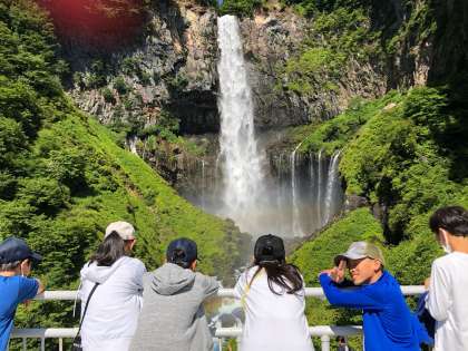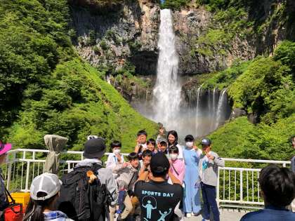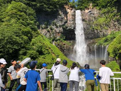 通路を進むと、華厳の滝が見えてきました。子どもたちからは2度目の驚きの声です。毎秒2トンの水が中禅寺湖から流れてきます。その迫力に子どもたちは圧倒されていました。上空にはイワツバメが飛び、水しぶきには虹が見えます。子どもたちは、辺り一面のきれいな景色に見とれていました。