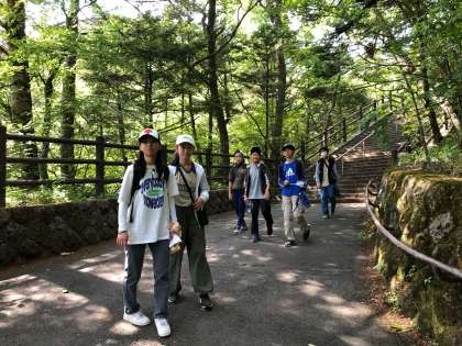子どもたちは、赤沼からくだり、竜頭の滝にやってきました。階段のところから竜頭の滝を見ます。