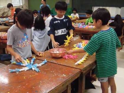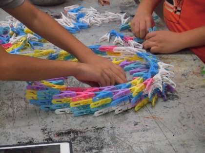図工の授業は、せんたくばさみを使い、つなげたり並べたりして様々な形をつくるという内容です。友達と協力する子、色にこだわる子、つなげていくうちに作りたい形が決まってくる子、皆、楽しそうです。