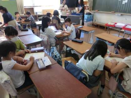 ポスターの用紙を真ん中に置き、みんなで楽しそうにかきすすめていました。