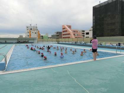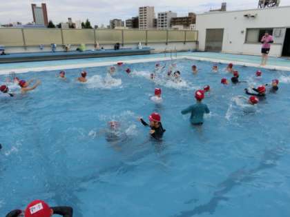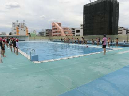 4年生の授業は体育の水泳です。今日はプール納めです。今までずっと暑かったのですが、今日はとてもすずしく、水に入っている人も少し寒そうです。