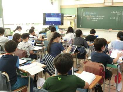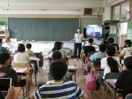 1組の授業は外国語です。英語支援員の先生の話やデジタル教材から流れる英文を子どもたちはしっかりと聞いていました。夏休みの思い出についての学習でした。