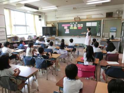 2年生のすこやかタイムです。きょうは「うんち」についての学習です。「うんち」は、体から出るサインであり、自分の健康の状態を知る大切なものだということを子どもたちは、教わりました。子どもたちはとても真剣に話を聞いていました。