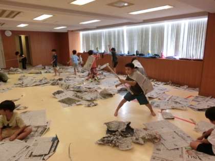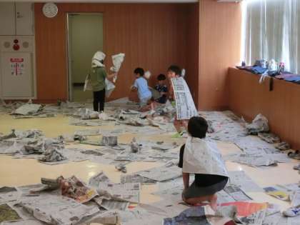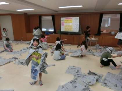 「新聞紙であそぼう」と題して、新聞紙を自由に使って、いろいろなものを作って遊んでいます。とてもダイナミックです。一人ひとり思い思いのものをつくっています。お姫さまや戦士に変身している人もいます。みんなとても楽しそうです。