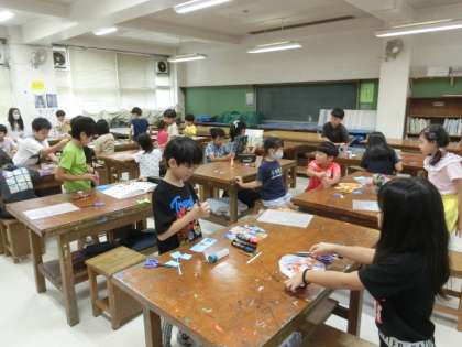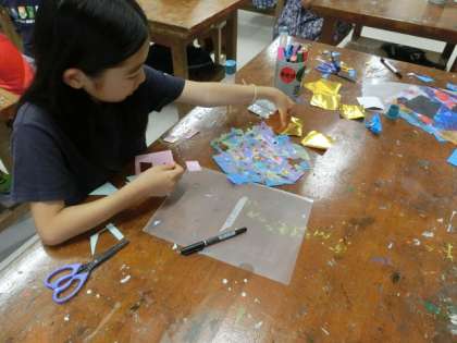 1組の授業は図工です。お花紙を使って模様をつくっています。自分の作品作りに夢中になっている姿がとてもすてきです。