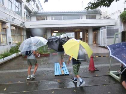 正門の前の排水が追い付かず、大きな水たまりになってしまいました。急きょ、すのこを置いてそこを通ってもらいました。