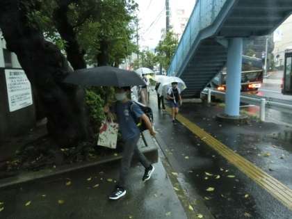 今日は台風の影響で朝から強い雨が降っています。子どもたちもそれぞれ雨対策をして登校しています。