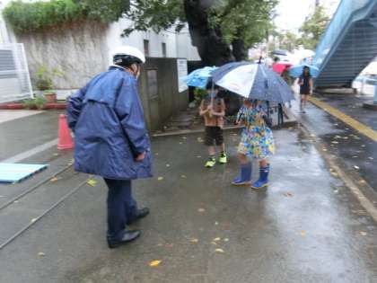 雨のひどい中、池尻交番のおまわりさんが見守りに来てくれました。