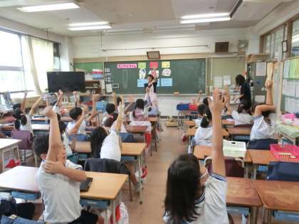 血液の役割について話がありました。片手長い時間手をあげていて、あげていなかった方の手と色を比べると、赤みが大きく違います。子どもたちはとてもびっくりしていました。出血した時の対応や鼻血の止め方などの話もありました。